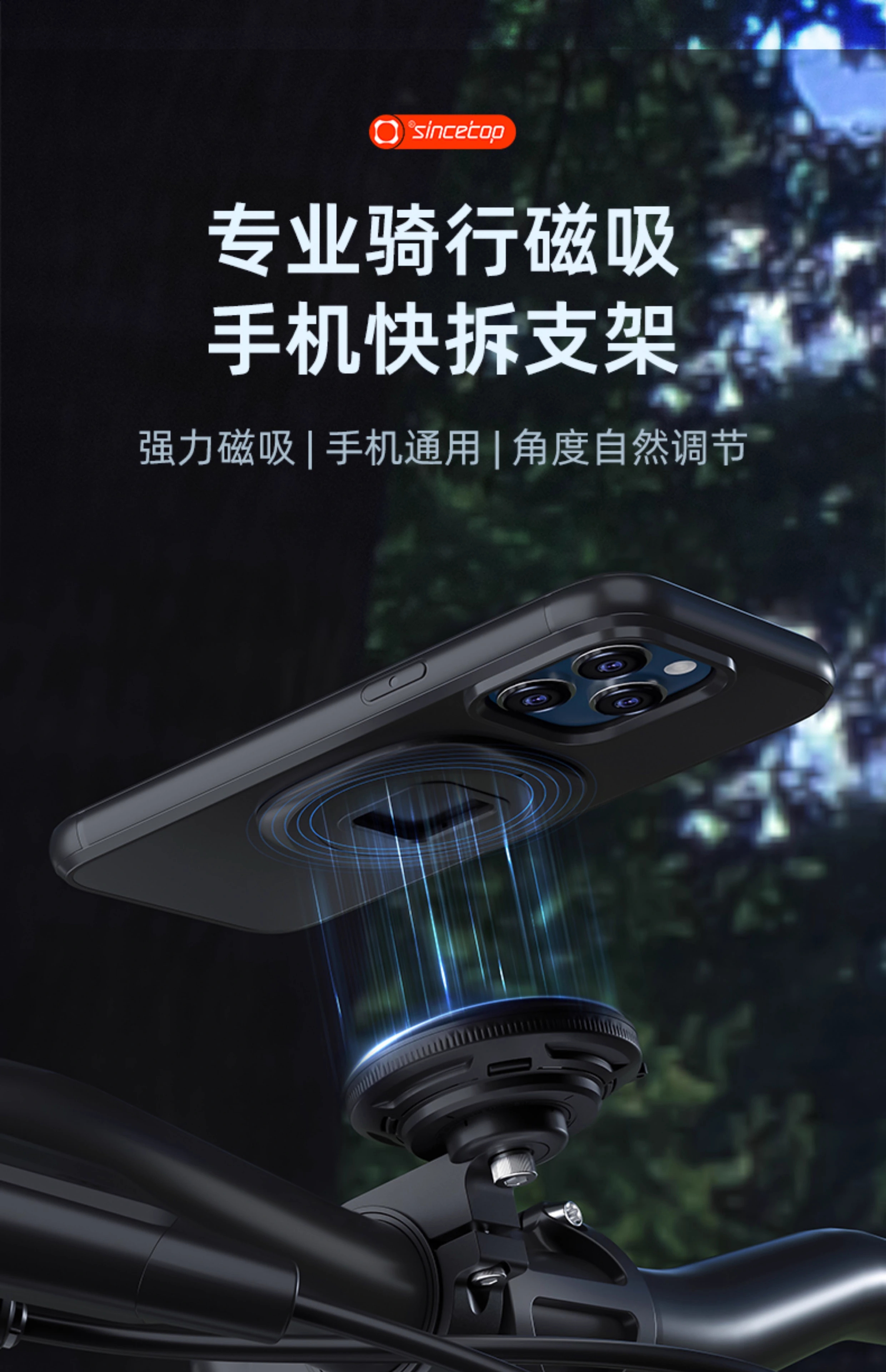 全球领先的骑行配件品牌SINCETOP今日正式发布创新产品**“专业骑行磁吸手机快拆支架”**。该产品以“强力磁吸、手机通用、角度自然调节”为核心设计理念,旨在为骑行爱好者提供更安全、便捷的手机固定解决方案,同时满足日常多场景使用需求。